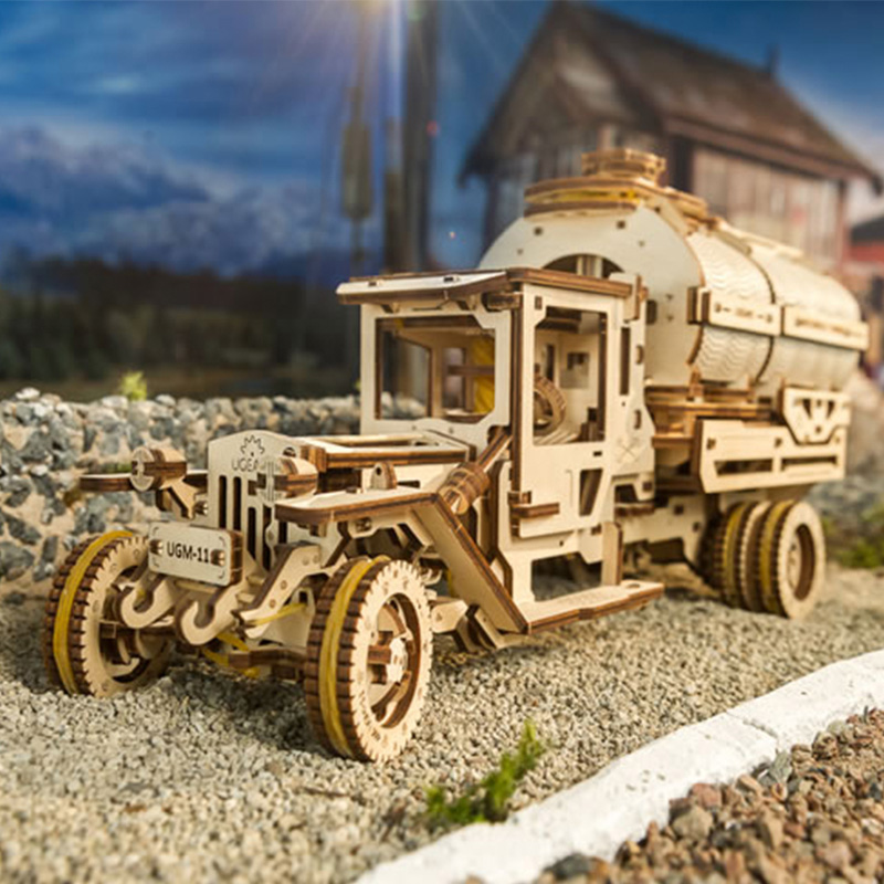 A: 全部采用木质材料,是UGEARS的风格,木料有一定的延展性和韧性,很适合榫卯结构,能做到不使用胶水但又相当牢固。而且在很多型号,牙签充当了不同的角色,还需要截断不同的长度。